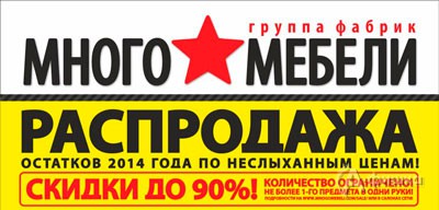 Только две недели, с 17 по 31 мая 2015 г., в магазинах группы фабрик «Много Мебели» пройдёт уникальная распродажа остатков мебели 2014 года по ценам ниже себестоимости – со скидками до 90%!