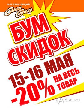 В магазинах косметики и бытовой химии «Санги Стиль» 15 и 16 мая 2015 г. снова бум скидок – скидка 20% на весь ассортимент; скидка 50% на парфюмерию; скидки до 25% на декоративную косметику; скидки до 25% на товары разных категорий!
