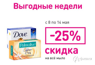 В сети магазинов «Магнит Косметик» проходит акция «Выгодные недели»! С 8 по 14 мая 2015 г. скидка 25% на все виды мыла!