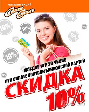 В магазинах косметики и бытовой химии «Санги Стиль» каждое 10 и 20 число действует акция – скидка 10% на всё при оплате банковской картой!