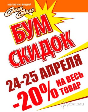 В магазинах косметики и бытовой химии «Санги Стиль» 24 и 25 апреля 2015 г. снова бум скидок – скидка 20% на весь ассортимент; скидка 50% на парфюмерию; скидки до 25% на декоративную косметику; скидки до 50% на товары разных категорий!