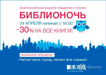 Всероссийская акция в поддержку чтения! 24 апреля 2015 г. в сети книжных магазинов «Читай-город» пройдет Библионочь! Начиная с 16:00 и до закрытия магазинов скидка 30% на все книги!