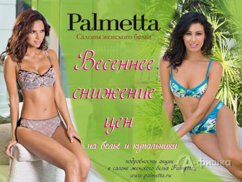В фирменных салонах женского белья «Palmetta» с 24 апреля 2015 г. весеннее снижение цен на модные коллекции белья и купальников! Радуйте себя покупками по приятным ценам!
