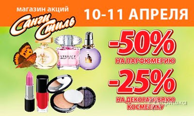 В магазинах косметики и бытовой химии «Санги Стиль» только 10 и 11 апреля 2015 г. бум скидок – скидка 15% на весь ассортимент; скидка 50% на парфюмерию; скидка 25% на декоративную косметику; скидки до 50% на товары разных категорий! А также акции «2 по цене 1» и «3 по цене 2»!