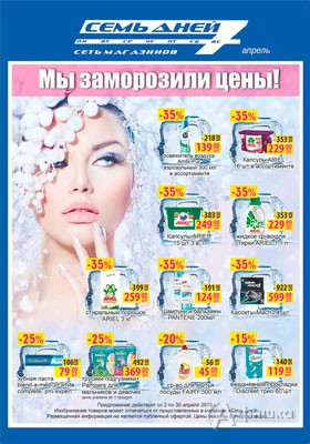 В сети магазинов парфюмерии, косметики и бытовой химии «7 дней» в Белгороде со 2 по 30 апреля 2015 г. проходит акция «Мы заморозили цены»! На косметику и бытовую химию скидки до 35%!