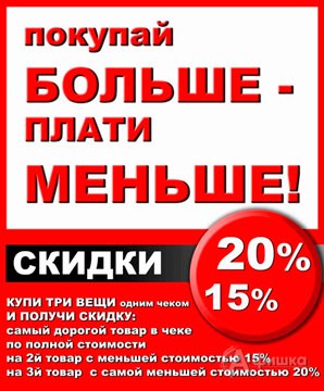 С 1 апреля 2015 г. в магазинах «Спортивный мир» действует выгодное предложение «Покупай больше – плати меньше»! Купи три вещи одним чеком и получи скидку 15% на второй товар и скидку 20% на третий товар!