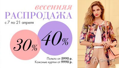 С 7 по 21 апреля 2015 г. в магазине «Снежная Королева» в Белгороде проходит весенняя распродажа – cкидки до 40% на модные пальто, плащи, куртки, тренчи и, конечно, коллекцию верхней одежды из натуральной кожи!