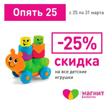 В сети магазинов «Магнит Косметик» проходит акция «Опять 25!» С 25 по 31 марта 2015 г. скидка 25% на все детские игрушки!