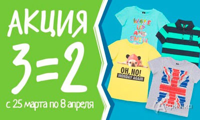 В магазинах модной детской одежды «Acoola Kids» в Белгороде с 25 марта по 8 апреля 2015 г. проходит акция «3=2»! При одновременной покупке 3-х вещей Вы платите только за две! В акции участвуют брюки и базовые футболки.