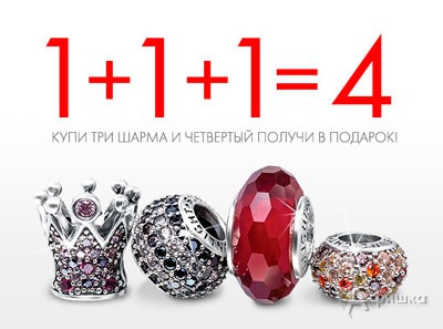 В ювелирных магазинах «Sunlight» с 27 марта 2015 г. проходит акция «1+1+1=4» – купи три шарма и четвёртый получи в подарок!
