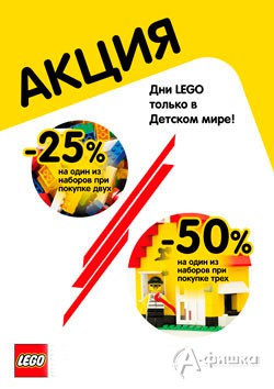 В магазине «Детский мир» только с 19 по 22 марта 2015 г. проходит акция «Дни Lego»! При покупке двух наборов Вы получаете скидку 25% на один из наборов, а при покупке трех – скидку 50% на один из наборов!
