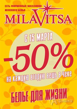 В фирменных магазинах женского белья «Milavitsa» в Белгороде с 15 марта 2015 г. проходит акция – на каждую вторую вещь в чеке скидка 50%!