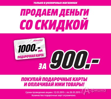 В магазине бытовой техники и электроники «Media Markt» до 28 марта 2015 г. проходит акция «Продаём деньги со скидкой»! Все подарочные карты номиналом от 1 000 до 10 000 руб. по цене 90% от их стоимости!