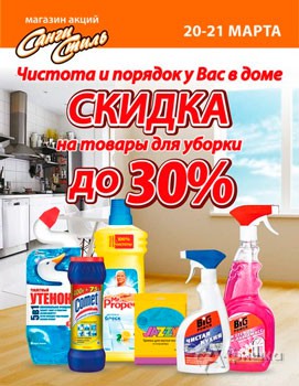 В магазинах косметики и бытовой химии «Санги Стиль» с 20 по 21 марта 2015 г. проходит акция «Чистота и порядок у Вас в доме» – скидки до 30% на товары для уборки.