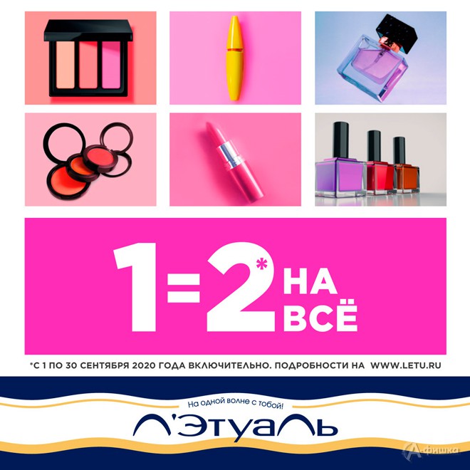 1=2 на всё в «Л’Этуаль» При покупке одного товара второй вы получаете в подарок! Опубликовано: 01 сентября 2020 г.