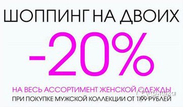 С 5 по 18 мая 2014 г. в магазинах одежды «Incity» проходит акция «Шоппинг на двоих» – при покупке мужской коллекции на сумму от 1199 руб., предоставляется скидка 20% на весь ассортимент женской одежды!
