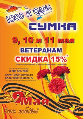 9, 10 и 11 мая 2014 г. в магазинах сети «1000 и одна сумка» в честь Дня Победы действует акция: скидка 15% ветеранам!