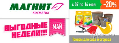 В сети магазинов «Магнит Косметик» проходит акция «Выгодные недели»! С 7 по 14 мая 2014 г. действует скидка 20% на все товары для сада и огорода!
