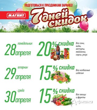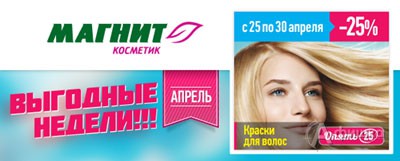 В сети магазинов «Магнит Косметик» продолжается акция «Выгодные недели» – до 6 мая 2014 г. скидки до 25% на различные группы товаров! С 25 по 30 апреля 2014 г. скидка 25% на все краски для волос!