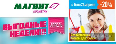В сети магазинов «Магнит Косметик» продолжается акция «Выгодные недели» – до 6 мая 2014 г. скидки до 25% на различные группы товаров! С 16 по 24 апреля 2014 г. скидка 20% на все хозяйственные товары для уборки дома!