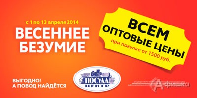 С 1 по 13 апреля 2014 г. в магазине товаров для дома «Посуда Центр» проходит акция «Весеннее безумие» – действуют оптовые цены на все товары при единовременной покупке на 1500 рублей в розничных ценах.