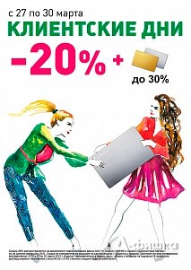 В универмаге «lady & gentleman CITY» с 27 по 30 марта 2014 г. проходят клиентские дни – уникальная скидка 20% на новую весенне-летнюю коллекцию! Постоянным клиентам скидки до 30%!