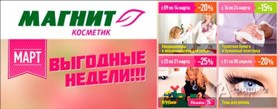 С 16 марта по 8 апреля 2014 г. в сети магазинов «Магнит Косметик» действует акция «Выгодные недели» – скидки до 25% на различные группы товаров!