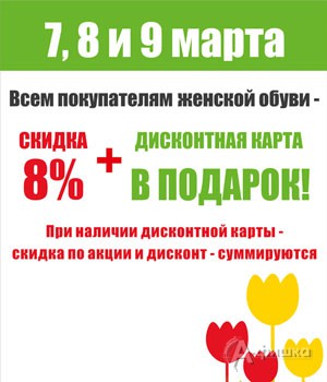 С 7 по 9 марта 2014 г. в обувных магазинах «Лёгкий шаг» в Белгороде акция – всем покупателям женской обуви скидка 8% + дисконтная карта в подарок!