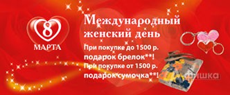 В Международный Женский день 8 марта 2014 г. в магазинах сети «1000 и одна сумка» действует акция: при покупке до 1500 руб. – подарок брелок; при покупке от 1500 руб. – подарок сумочка!