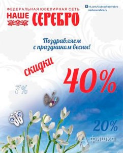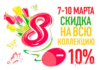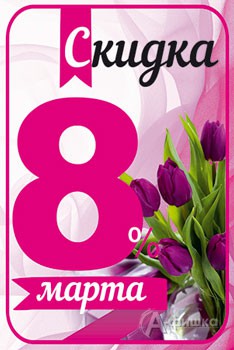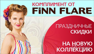С 6 по 10 марта 2014 г. в магазинах одежды «Finn Flare» проходит акция в честь 8 Марта – скидка 8% на новую коллекцию при покупке двух любых вещей для покупателей, у которых нет дисконтной карты. Для владельцев дисконтных карт – скидки по карте удваиваются!
