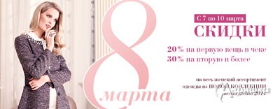 С 7 по 23 марта 2014 г. в магазинах одежды «Sela» проходит специальная акция — при покупке вещи из новой коллекции, вы получаете скидку 50% на второе изделие!