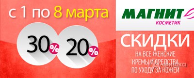 С 1 по 8 марта 2014 г. в сети магазинов «Магнит Косметик» действует акция – скидка 30% на всю женскую парфюмерию и скидка 20% на все женские кремы и средства по уходу за кожей!