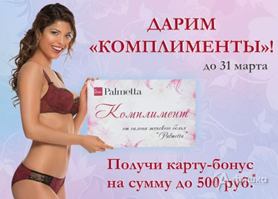 С 28 февраля по 31 марта 2014 г. в фирменных салонах женского белья «Palmetta» проходит акция «Дарим комплименты» — получите карту-бонус до 500 рублей при покупке! Чем больше покупка, тем больше сумма бонуса!