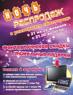 С 21 на 22 февраля 2014 г. с 21:00 до 00:00 в универмаге «Белгород» состоится ночь распродаж! Фантастические скидки до 70% во всех магазинах и уникальные подарки покупателям!