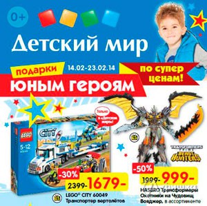 К предстоящему празднику – Дню защитника Отечества – в «Детском мире» до 23 февраля 2014 г. проходит акция «Подарки юным героям по суперценам» – действуют скидки до 50% на игрушки для мальчиков!