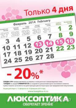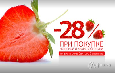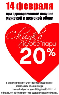 Только 14 февраля 2014 г. в обувных магазинах «Лёгкий шаг» в Белгороде акция – при одновременной покупке мужской и женской обуви скидка 20% на обе пары!