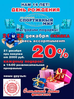 Сети магазинов «Спортивный мир» в Белгороде – 14 лет! 21 и 22 декабря 2013 г. в честь Дня рождения скидка 20% на весь ассортимент! 21 декабря при покупке от 2000 руб. каждому покупателю – подарок!