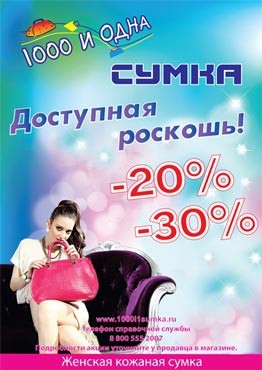 Со 2 декабря 2013 г. в магазинах «1000 и одна сумка» действует акция «Доступная роскошь» – скидки 20-30% на кожаные женские сумки фирм «Geya», «Liphnizar» и «Gold Leather»!