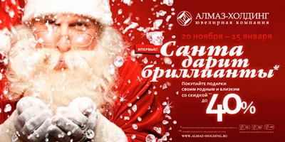 С 20 ноября 2013 г. по 15 января 2014 г. в белгородском магазине ювелирной сети «Алмаз-Холдинг» пройдет акция «Санта дарит бриллианты». Скидки до 40% на ювелирные украшения!