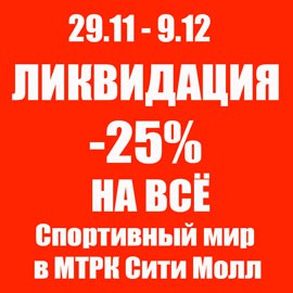 С 29 ноября по 9 декабря 2013 г. в магазине «Спортивный мир» проходит ликвидация товара – скидка 25% на весь ассортимент!