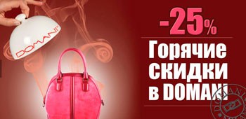 До 21 ноября 2013 г. в салоне сумок и аксессуаров «Domani» проходит горячая пора скидок! На новую коллекцию скидка 25%! На определенный ассортимент в салоне скидки от 20 до 40%.