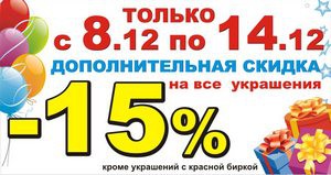 Только с 8 по 14 декабря в сети ювелирных салонов-магазинов «Яшма-Золото» действует дополнительная скидка 15% на все украшения!