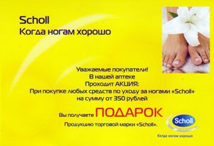 В аптеке БелГУ в Белгороде проходит акция марки «Scholl»: «Когда ногам хорошо»! При покупке любых средств по уходу за ногами «Scholl» на сумму от 350 рублей Вы получаете подарок!