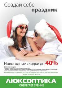 С 1 декабря 2011 г. по 15 января 2012 г. в оптике «Люксоптика» действуют новогодние скидки: на оптику – 20%, на солнцезащитные очки – 40%.