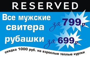 В магазине одежды «RESERVED» 6 декабря началась новогодняя распродажа! Скидка 1000 руб. на все модели взрослых теплых курток! А также скидки на свитера и рубашки.